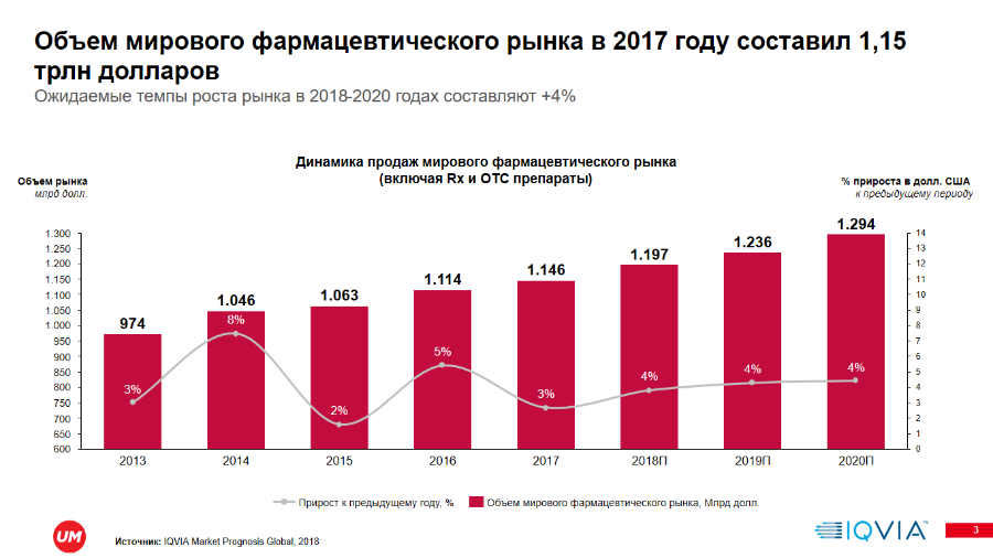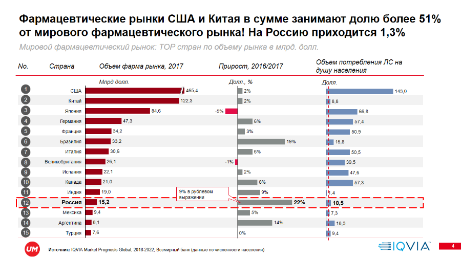 Объем российского фармацевтического рынка оценивается в $15,2 млрд по итогам 2017 г. Это составляет 1,3% глобального рынка, достигшего за прошлый год $1,15 трлн. Крупнейшими игроками в мировой фарминдустрии являются Китай и США — их совокупная доля составляет 51% от глобального оборота.
