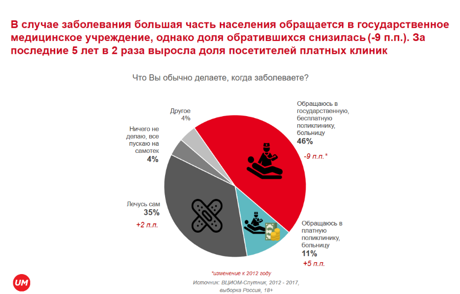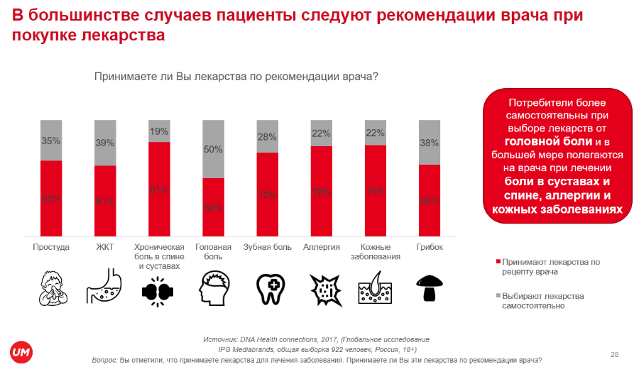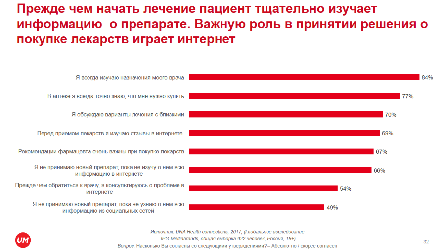 Что касается решения о покупке лекарств, то, согласно глобальному исследованию IPG Mediabrands «DNA Health connections», в России в большинстве случаев пациенты следуют рекомендации врача. Но прежде чем начать лечение, 84% наших соотечественников тщательно изучают информацию в интернете о препарате, выписанном врачом, и отзывы имеют большое значение для принятия решения о покупке.