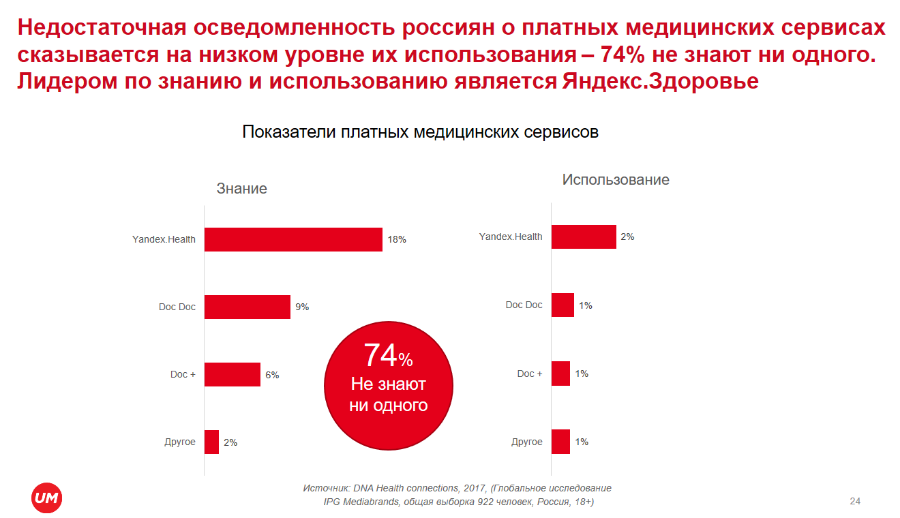 Это подтверждает и рост популярности платных клиник — за последние 5 лет в 2 раза выросла доля их посетителей, тогда как доля обратившихся в государственные медицинские учреждения снизилась на 9 п. п. Однако уровень использования платных медицинских онлайн-сервисов у российских пользователей довольно низкий, что является результатом недостаточной осведомленности о них — 74% не знают ни одного. Лидером по знанию и использованию является «Яндекс.Здоровье» (18%).