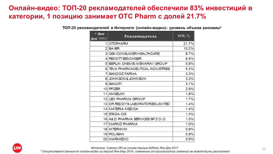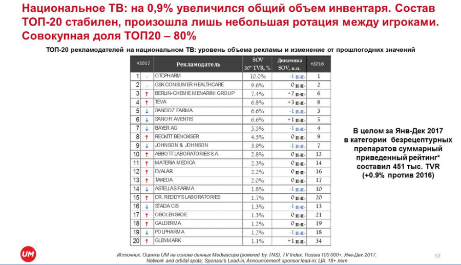 Ключевым медиа для фармацевтики по-прежнему остается телевидение: здесь сосредоточено 84% всех рекламных бюджетов, тогда как в интернете пока 3%. Однако активно растет сегмент онлайн-видео, имеющий большой потенциал с точки зрения эффективного построения коммуникации фарма-брендов и аудитории. Вторым медиаканалом после ТВ по итогам прошлого года стало радио с существенным увеличением рекламных инвестиций — общий объем бюджетов увеличился здесь на 30% по сравнению с 2016 г., а также существенно изменился состав топ-20 рекламодателей. На национальном ТВ число фарма-рекламодателей и брендов изменилось незначительно. Состав топ-20 остается здесь стабильным, произошла лишь небольшая ротация между игроками. Первая двадцатка рекламодателей обеспечивает 80% всех медиаинвестиций.