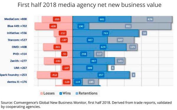 Агентство Mediacom (входит в WPP) возглавило рейтинг по сумме полученной прибыли, полученной за тендеры в первой половине 2018 г. Об этом сообщается в отчете Global new business monitor исследовательской компании Comvergence. Согласно исследованию, агентство выиграло глобальных тендеров на сумму $800 млн.
