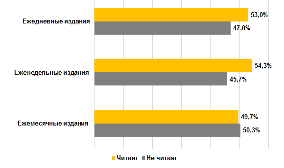 Самыми лояльными потребителями печатных средств массовой информации оказались представители группы с высоким доходом — среди них ежедневные издания читают 58,4% респондентов, 57,1% предпочитают ежедневные, ежемесячными изданиями интересуются 53,3% опрошенных.