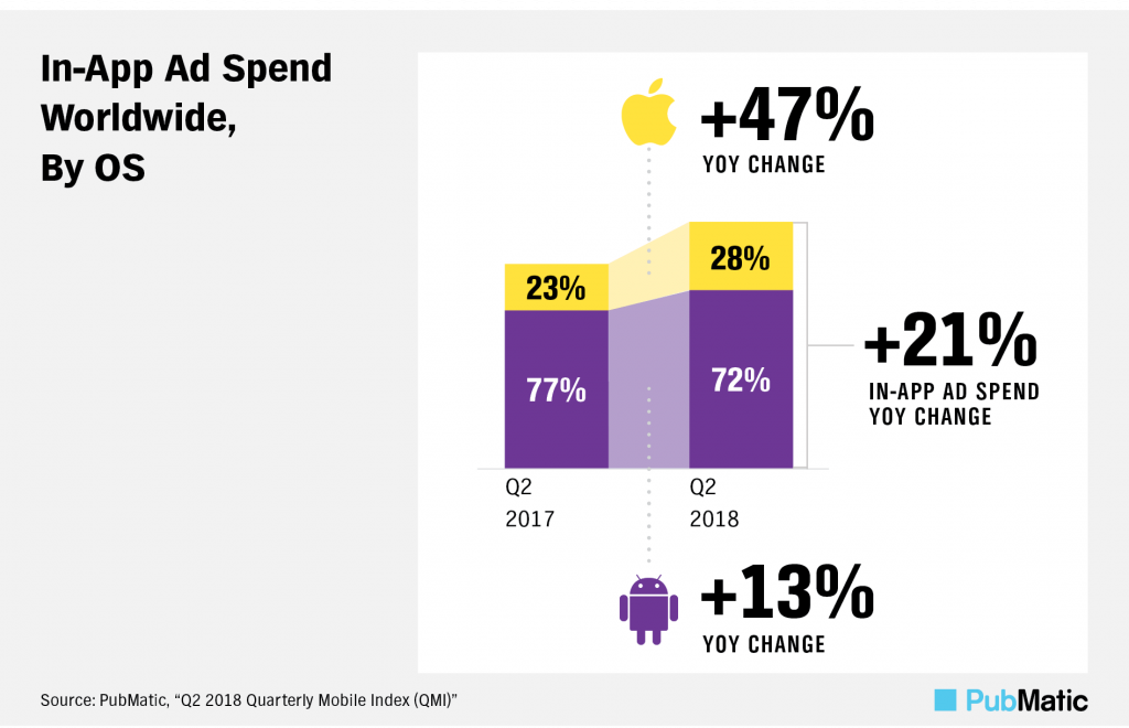 Согласно данным исследования Mobile Index, которое проводит платформа PubMatic, глобальные затраты рекламодателей на мобильную рекламу выросли на 25% во втором квартале 2018 г. Более половины от всего роста мобильной рекламы приходится на рекламу в мобильных приложениях.