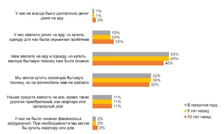 43% опрошенных заявили, что как в минувшем году, так и 5 лет назад им хватало средств на приобретение еды и одежды, но купить мелкую бытовую технику было сложно. Чуть меньше аналогичных ответов приходится на период 10 лет назад — 40%.