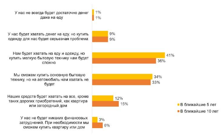 Доля респондентов, рассчитывающих через 10 лет позволить себе автомобиль, составила 15%. Через 5 лет о таких перспективах заявил каждый восьмой респондент (12%). Абсолютного финансового благополучия, когда можно позволить себе любую покупку, включая загородный дом, в горизонте 5 лет планируют достичь (или сохранить) 3% респондентов, а через 10 лет — 6%.