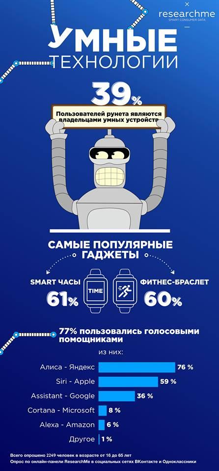 Только 39% пользователей интернета в России обладают умными устройствами, говорится в исследовании компании ResearchMe. Наибольшей популярностью среди отечественной аудитории пользуются умные часы (61%) и фитнес-браслеты (60%).