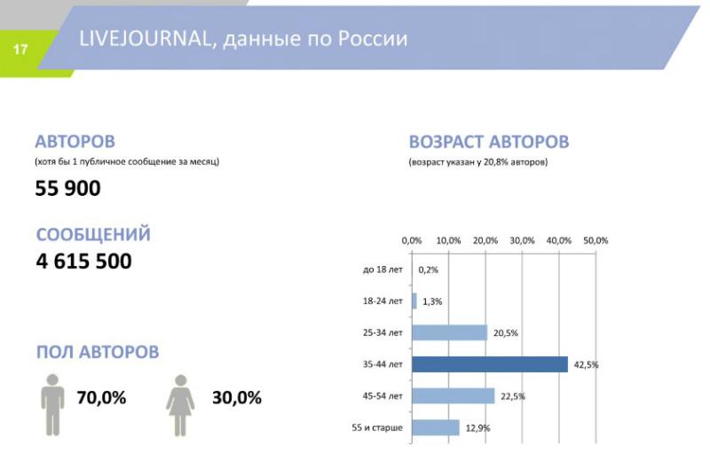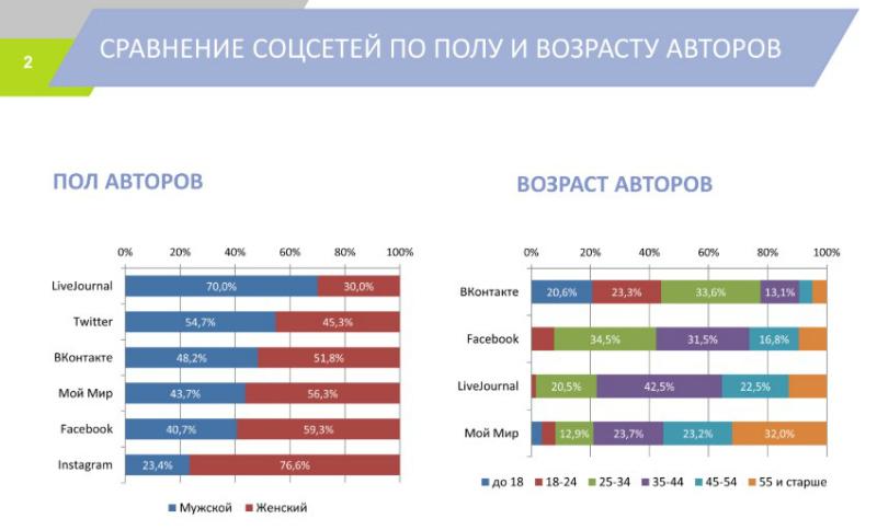 Наибольшую популярность среди женской аудитории получил Instagram c 77% пользователей женского пола против 23% мужского. На втором месте Facebook c долей девушек в 59%. Более «мужской» соцсетью оказался Livejournal, там доля женщин составила всего 30%.