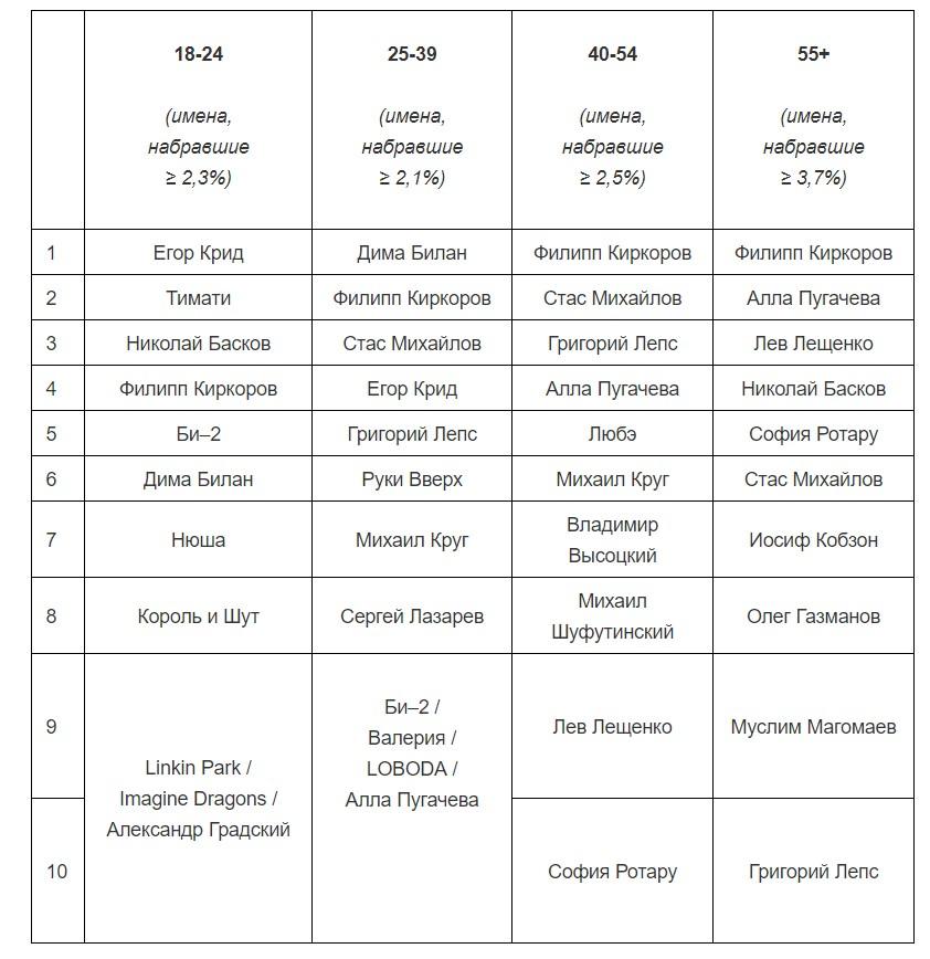 Любимым исполнителем по результатам исследования оказался Филипп Киркоров — за него проголосовало 8% респондентов разных возрастных категорий. За ним в рейтинге идут Алла Пугачева и Стас Михайлов с 5% голосов. Аудитория в возрасте от 18 до 24 лет предпочитает слушать Тимати, Егора Крида и Николая Баскова.