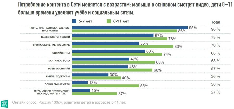 Интернетом пользуются 93% детей в возрасте 5–11 лет, это почти 5 млн человек. Среди возрастной группы 5–7 лет (2,1 млн человек) в интернет выходят 89%, а среди 8–11 лет — 97% (2,74 млн человек).