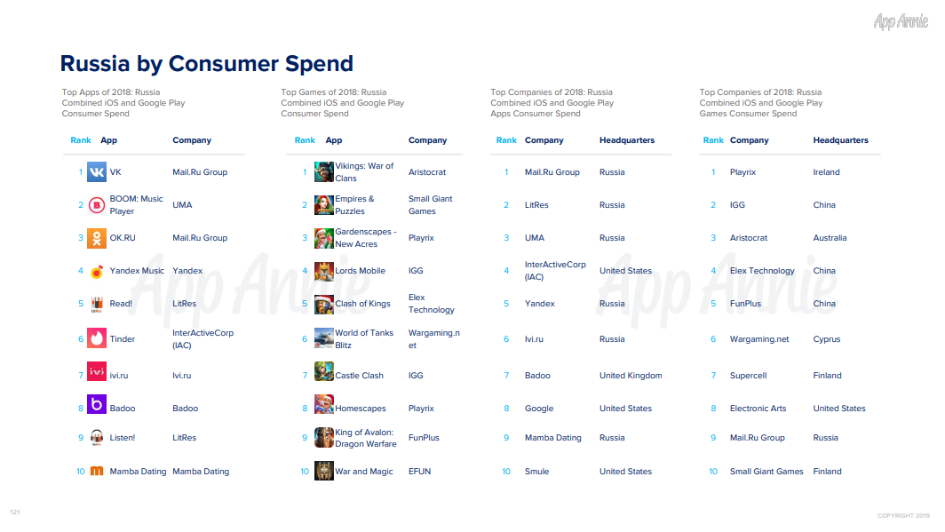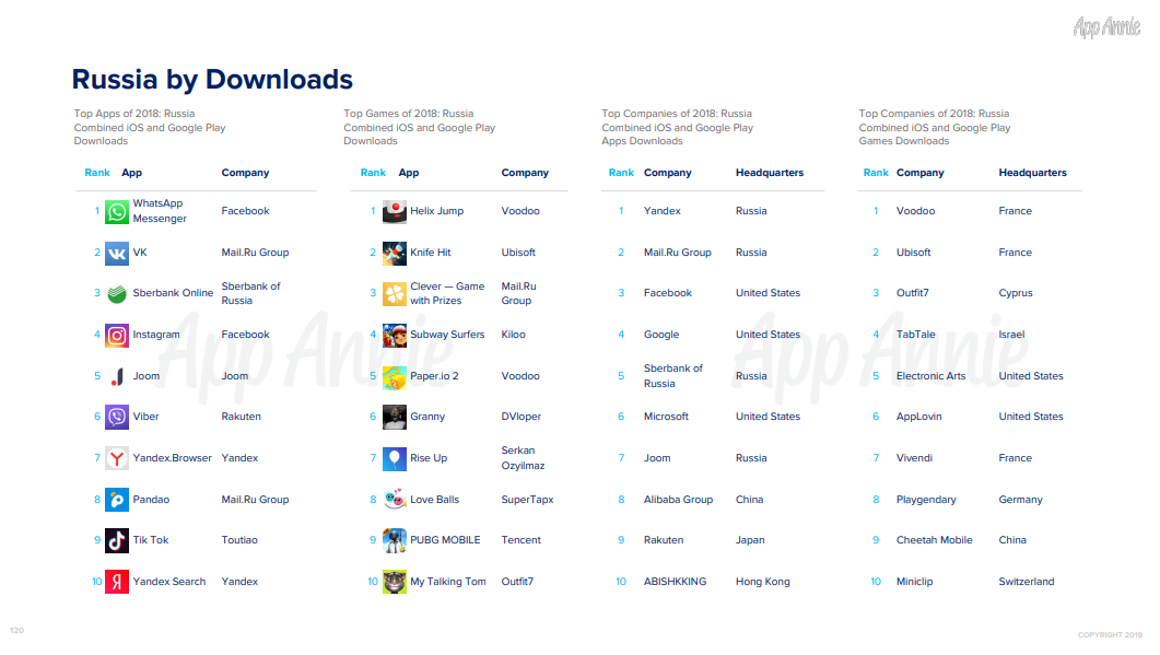 За прошлый год пользователи по всему миру совершили 194 млрд загрузок. В России самым популярным приложением по количеству скачивание в AppStore и Google Play стал мессенджер WhatsApp. За ним следуют «ВКонтакте», «Сбербанк Онлайн», Instagram и маркетплейс Joom. Согласно данным исследования, чаще всего пользователи скачивают приложения «Яндекса», Mail.Ru Group, приложения компании Facebook и Google.