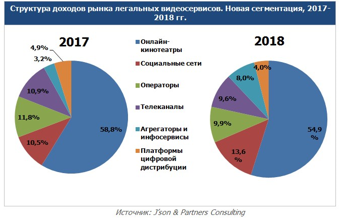 В общей выручке выросла доля социальных сетей («ВКонтакте», «Одноклассники», Facebook, Instagram и др.) — с 10,5% до 13,6%, а также агрегаторов и инфосервисов («Чемпионат.com», «Афиша», «Яндекс.Видео» и др.) — с 3,2% до 8%. При этом доля онлайн-кинотеатров на рынке за год сократилась с 58,8% до 54,9%.