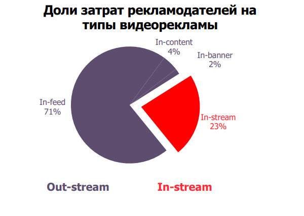 Рекламодатели отдают предпочтение out-stream-роликам: на них приходится 77% вложений. Самый популярный формат в этой категории — нативные видеопосты с автозапуском в лентах соцсетей (92% расходов в категории out-stream). Остальные 23% расходов на видеорекламу относятся к in-stream роликам — прероллам к видео в социальных сетях, на проектах Mail.ru Group и в партнерской сети.