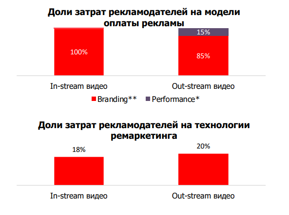 Видеореклама помогает компаниям повышать узнаваемость брендов и лояльность к ним (имиджевые задачи), а также мотивировать пользователей совершать целевые действия (performance-задачи). С помощью in-stream-роликов рекламодатели преимущественно решают первый тип задач. В сегменте out-stream 85% вложений используют для решения имиджевых задач, а 15% — performance-задач. In-stream и out-stream ролики могут эффективно привлекать аудиторию на сайт или увеличивать показатели конверсии. Форматы позволяют добавить кнопку призыва к действию, что мотивирует пользователей переходить на сайт магазина и страницу компании или устанавливать приложение. Рекламодатели также используют технологии ремаркетинга, чтобы показывать ролики тем, кто уже интересовался продуктом или услугой. Инструмент используют для продвижения 20% out-stream-видео и 18% in-stream.