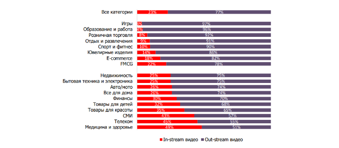 Эксперты проанализировали, как рекламодатели разных товарных категорий распределяют бюджеты между out-stream- и in-stream-видео в маркетинг-миксе. Во всех сегментах более половины затрат приходится на out-stream-ролики, хотя в некоторых категориях in-stream уступает незначительно. Например, самые высокие доли инвестиций в in-stream были отмечены в секторах «Медицина и здоровье» (49%), «Телеком» (45%) и «СМИ» (43%). Наибольшее предпочтение out-stream-видеорекламе отдают в категориях «Игры» (97%), «Образование и работа» (96%) и «Розничная торговля» (92%).