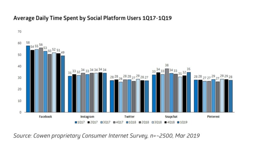 Фирма финансовых услуг Cowen провела социальный опрос среди 2,5 тыс. респондентов и выяснила, что в первом квартале 2019 г. пользователи ежедневно проводили в Facebook в среднем 49 минут, что на 9 минут меньше, чем за аналогичный период 2017 г. На просмотр ленты приложения Instagram у людей в среднем уходит до 34 минут в день — это на 3% больше, чем в прошлом году.
