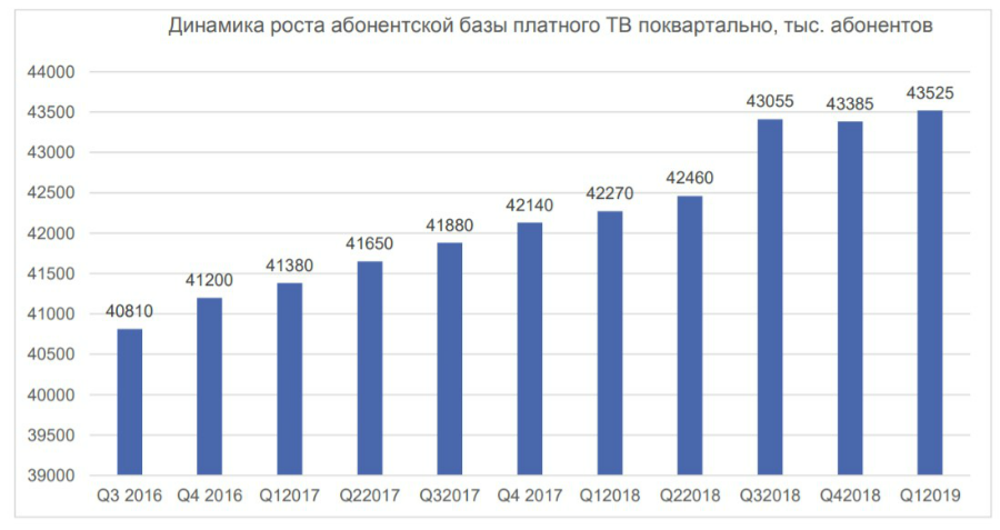 По данным исследования информационно-аналитического агентства Telecom Daily, прирост числа абонентов платного ТВ в первом квартале 2019 г. составил 150 тысяч домохозяйств. Генеральный директор TelecomDaily Денис Кусков связывает это с распространением телесетей в новые города.