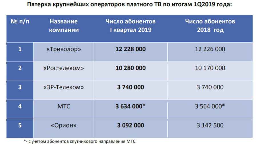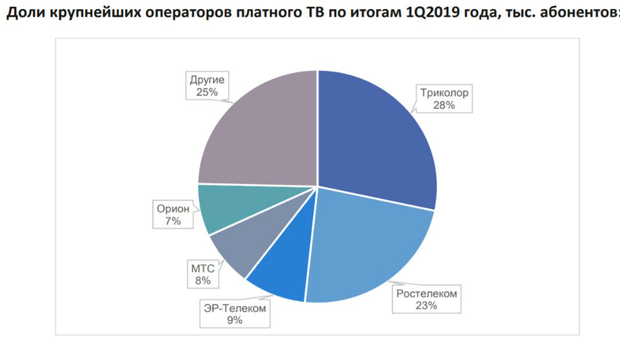 Лидером среди российских спутниковых операторов по числу абонентов остался «Триколор», база которого составила 12,2 млн домохозяйств на март 2019 г. На втором месте «Ростелеком» — к нему подключились 10,3 млн домохозяйств. Третий среди операторов-лидеров «ЭР-Телеком», завершивший квартал с базой в 3,7 млн абонентов.