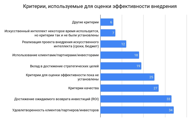 Главными критериями оценки работы ИИ респонденты назвали удовлетворенность клиентов — 34% и достижение возврата инвестиций (ROI) — 33%.