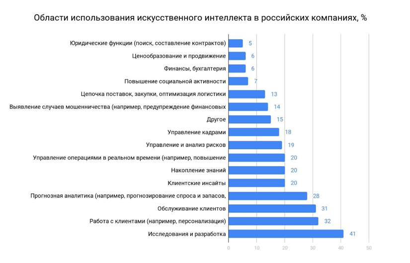 Самым распространенным решением на базе ИИ являются виртуальные помощники, которые применяют в работе 38% руководителей и ведущих специалистов. Следом идут технологии машинного обучения и прогнозного анализа — их используют 35% респондентов. 32% отметили, что используют ИИ для обслуживания клиентов. Наименьшее количество респондентов применяет технологию в юридических процессах, а также финансах и бухгалтерии — всего 6%.
