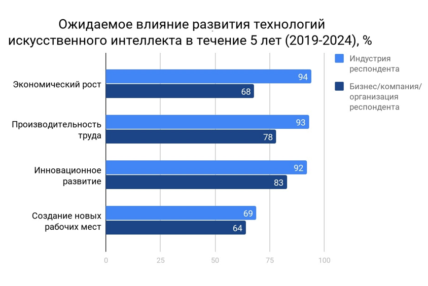 Более 90% респондентов полагают, что ИИ существенно повлияет на экономический рост страны, инновационное развитие и производительность труда в 2019 — 2024 гг.