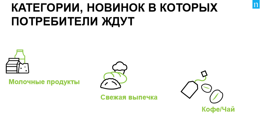 В 2019 г. потребители ждут выхода новинок в категориях молочных продуктов, выпечки, кофе и чая. Как следует из отчета, более трети россиян готовы переплачивать за экологичные товары. 37% покупателей утверждают, что согласны платить премиум-цену за продукты, содержащие лучшие и дополнительные питательные свойства. А 29% отметили, что заявления на упаковке «Натуральный продукт» и «Органик» будут являться стимулом к выбору именно этого товара.