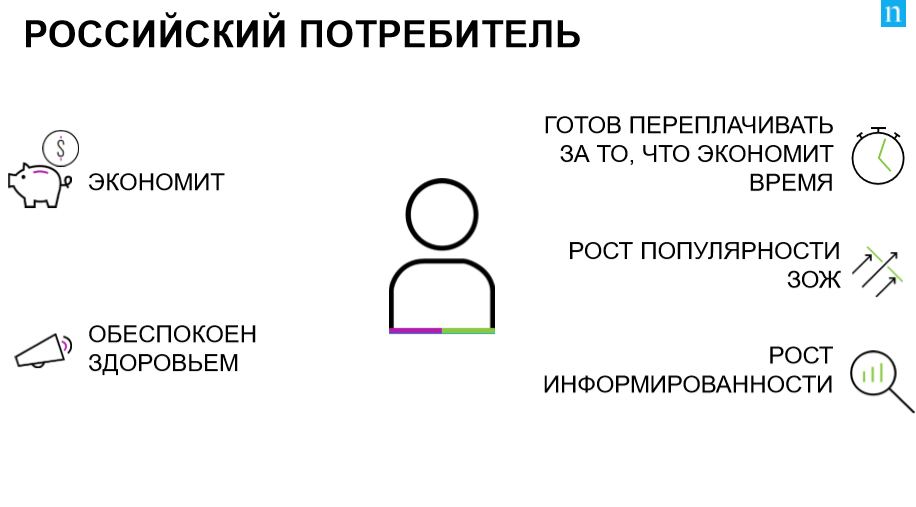 Ежегодно на российский рынок FMCG выходит более 40 тыс. новых продуктов. Из них около 1200 формируют 90% денежного оборота, сообщают исследователи. По оценкам Nielsen, ключевыми трендами у российского потребителя стали: экономия, обеспокоенность здоровьем, готовность переплачивать за то, что экономит время, и рост популярности ЗОЖ.