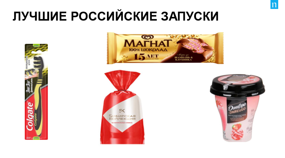 Nielsen объявила самые успешные запуски новинок в продовольственных и непродовольственных категориях в России. По итогам 2017–2018 гг. первое место в рейтинге заняли пельмени «Сибирская коллекция на натуральных сливках», на втором месте коктейль «Даниссимо Shake&Go с клубникой», следом расположились мороженое «Магнат Марк Де Шампань & Клубника» и зубная щетка «Колгейт Зиг-Заг — Древесный уголь».