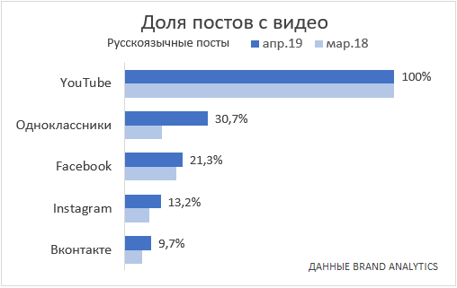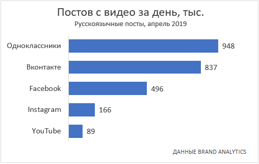 Пользователи «ВКонтакте» в апреле 2019 г. опубликовали 837 тыс. постов с видео в день. Однако тут доля таких постов от всего контента всего 9,7%. У Facebook эти показатели были на уровне 496 тыс. публикаций с долей 21,3%, у Instagram — 166 тыс. постов, доля 13,2%, у YouTube — 89 тыс. и 100%.