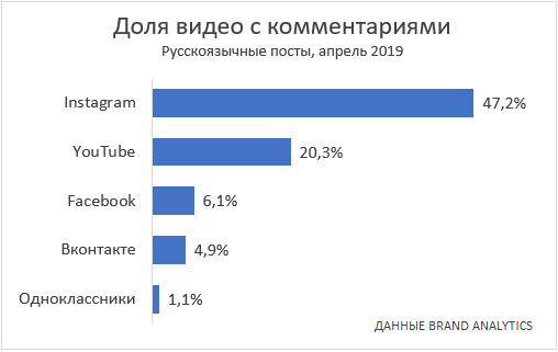 Рост комментируемости показали только Instagram (доля видео с комментариями тут составляет 47,2%), YouTube (20,3%) и Facebook (6,1%). У «Одноклассников» (1,1%) и «ВКонтакте» (4,9%) комментируемость несколько снизилась.