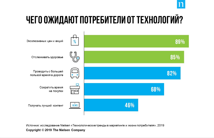 Самое главное ожидание от технологий в будущем — персонализированный подход. 89% российских потребителей хотят получить доступ к персонализированным скидкам и промоакциям (89%) и возможности отслеживания показателей состояния здоровья онлайн (85%). Около половины опрошенных заинтересованы в развлекательном контенте на основе личных предпочтений. Причем у поколения Z этот показатель еще выше — 61% хочет получать персонализированный аудио- и видеоконтент. Уже сегодня, по данным Nielsen Promo Pressure, до 50% товаров повседневного спроса в крупнейших категориях продаются со скидками.