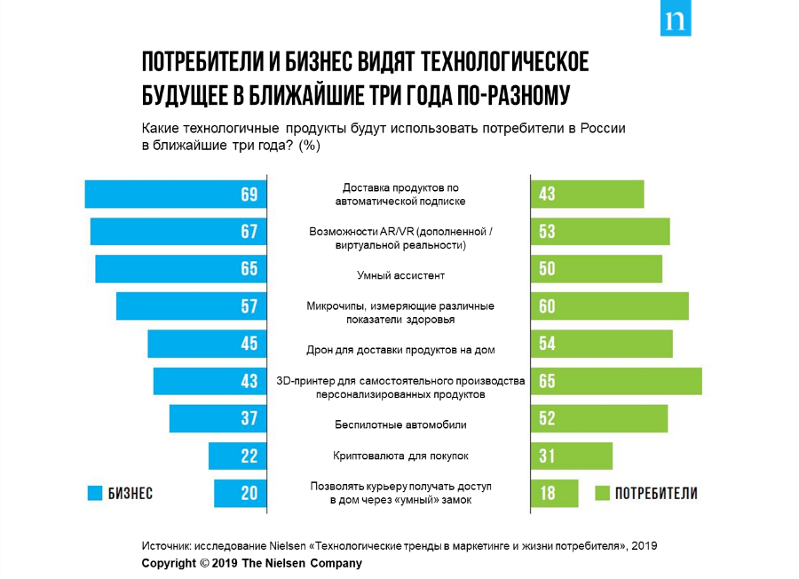 Согласно исследованию Nielsen, потребители верят, что в ближайшие годы они смогут производить персонализированные продукты на 3D-принтере (65%) и использовать микрочипы для мониторинга состояния здоровья (60%). Также, по мнению респондентов, продукты можно будет доставлять дронами (54%), будут активнее использоваться возможности дополненной и виртуальной реальности (53%). Среди других популярных в будущем технологий россияне назвали беспилотные автомобили (52%), ассистентов для решения повседневных задач (50%) и доставку продуктов по автоматической подписке (43%).