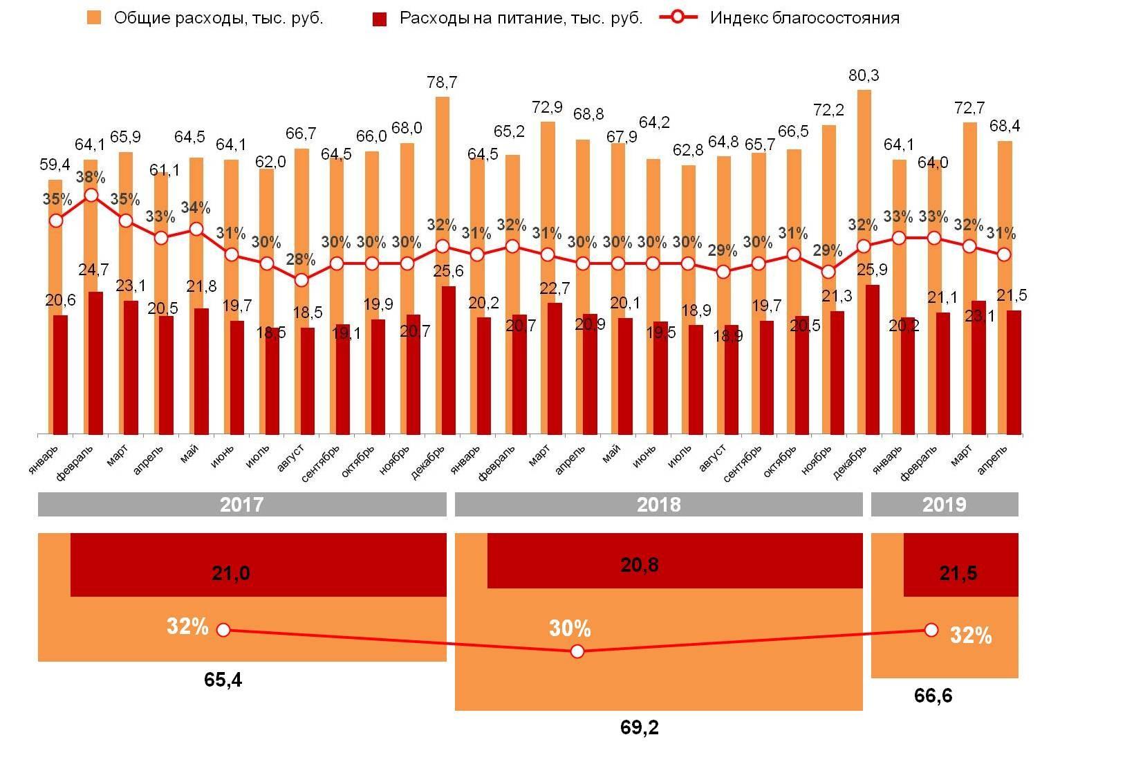 В 2019 г. доля затрат на продукты питания в общей корзине расходов российских семей составляет 32%. В 2018 г. этот показатель находился на уровне 30%, в 2017 г. равнялся 32%.