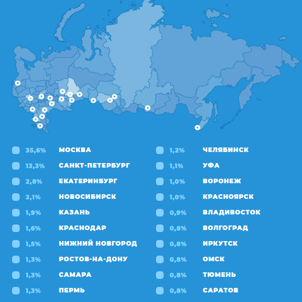 Лидерами по числу пользователей мессенджера остаются Москва (среди опрошенных — 36% москвичей) и Санкт-Петербург (13%). «Хотя больше 50% пользователей не относятся к двум столицам, проникновение Telegram в малые города все еще довольно слабое», — отмечается в исследование.