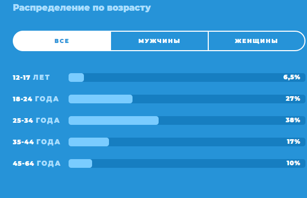 Больше всего в Telegram представителей возрастных групп 25–34 (38%) и 18–24 (27%). По сравнению с 2017 г. стали более широко представлены группы 35–44 и 45–64, что означает, что мессенджер перестает быть сугубо молодежным, подчеркивают авторы исследования.