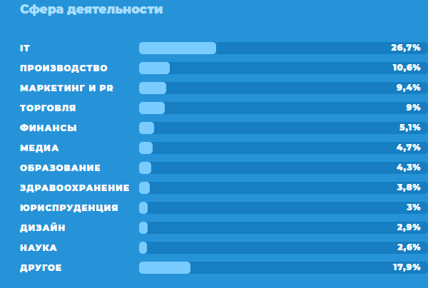 Среди популярных сфер деятельности пользователей мессенджера — IT, производство, а также маркетинг и PR. (26,7%, 10,6% и 9,4% от всего числа респондентов соответственно). 84% опрошенных имеют оконченное или неоконченное высшее образование либо получают его сейчас. 59% пользователей зарабатывают ежемесячно более 46 тыс. руб., а 12,1% — более 151 тыс. руб. Почти половина опрошенных (48%) — это наемные сотрудники, 13% — руководители, 12% — фрилансеры, 6% — владельцы бизнеса. 21% респондентов не работает.