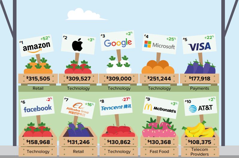 Второе место в рейтинге занимает компания Apple, а Google в этом году опустилась на третью строчку. Следом за ними идут Microsoft, Visa, Facebook и Alibaba. Российские компании не попали в топ-100. В этом году в рейтинг впервые вошли бренды Chanel, Xbox, Haier. За прошедший год значительно снизилась стоимость сегментов пивного производства, автопроизводителей, региональных и глобальных банков.