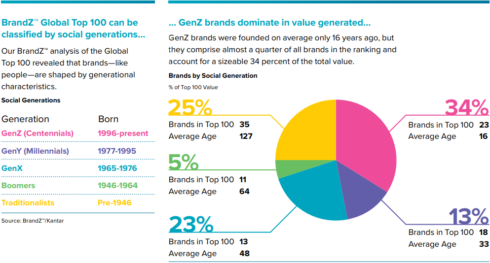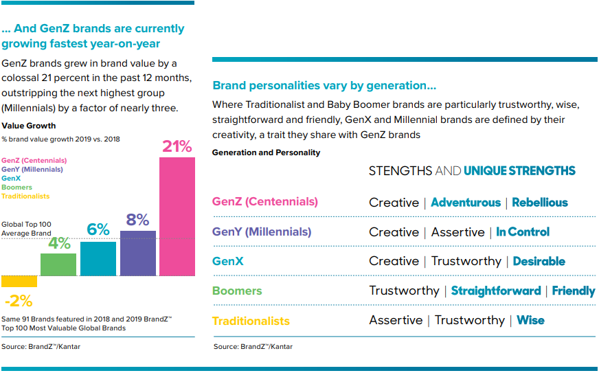 Ключевыми тенденциями 2019 г. стали быстрый рост сектора роскоши, несмотря на замедление мировой экономики, а также влияние возраста бренда на восприятие потребителя. К примеру, бренды поколения Z были основаны в среднем около 16 лет назад, однако на сегодняшний день они составляют четверть компаний в рейтинге и 34% от общей стоимости этих компаний. Бренды этого поколения выросли в стоимости на 21% за прошедший год и обошли группу лидеров — брендов-миллениалов.