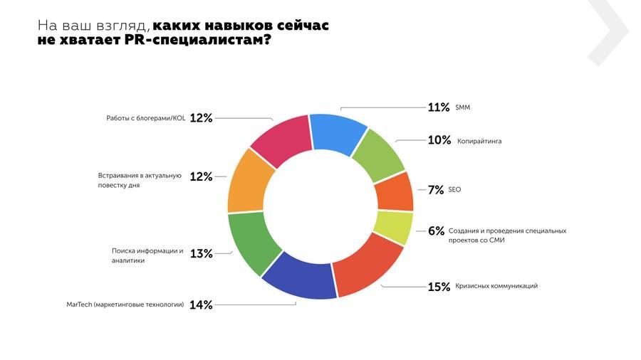 Опрошенные PR-специалисты отметили, что работникам сферы зачастую не хватает знаний и навыков в области маркетинга. Например, 14% респондентов заявили, что в коммуникациях с общественностью востребовано владение маркетинговыми технологиями. По словам 13% участников исследования, в PR нужны компетенции в поиске информации и аналитики. Однако чаще всего (15%) опрошенные отмечали навыки кризисных коммуникаций как самые необходимые в профессии.