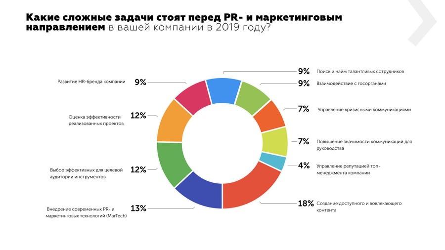 Согласно данным опроса, создание интересного контента стало не только самой затратной задачей для сферы PR, но и самой сложной. Эту часть коммуникации с аудиторией 18% специалистов назвали наиболее трудной. Следующая по сложности задача — внедрение современных маркетинговых технологий (13%) в работу компании. Также PR-директоры и менеджеры испытывают трудности при выборе эффективных инструментов для целевой аудитории (12%) и анализе результативности проектов.