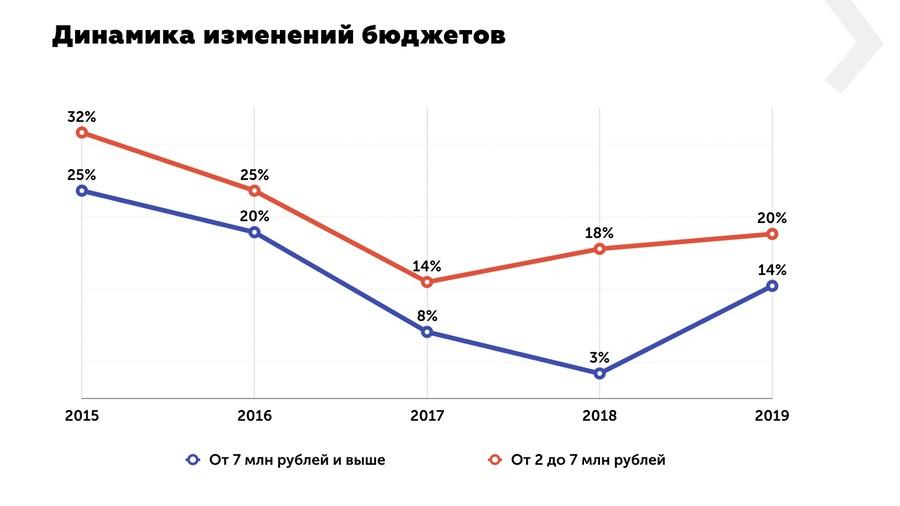 В 2019 г. компании стали выделять больше бюджета на PR-продвижение. По данным исследования сервиса HeadHunter и агентства Buman Media, 13% организаций тратят на коммуникации более 7 млн руб., что на 10% больше по сравнению с прошлым годом. Увеличилось и количество компаний, вложивших в связи с общественностью меньшую сумму: от 2 до 7 млн руб. Таких фирм оказалось 20% в 2019 г. среди принявших участие в опросе, а в 2018 г. — 14%.