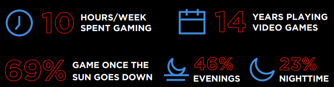 В среднем опрошенные проводят за игрой 7,5 часов в неделю (28% опрошенных — более 10 часов). Преимущественно играют ночью — на это время суток приходится 69% от общего времени. Современные геймеры — уже не дети, их средний игровой стаж — 14 лет. Играют, когда захотят, — 14% респондентов. 67% опрошенных посвящать больше времени играм мешает работа, 56% — семья.