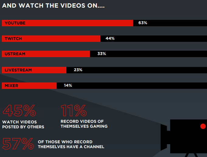 Игроки привыкли смотреть стримы, на которых проходят игры. YouTube является самой популярной платформой для просмотра игрового контента — его выбирают 63%, на втором месте Twitch c 44%, тройку замыкает Ustream — 33%.
