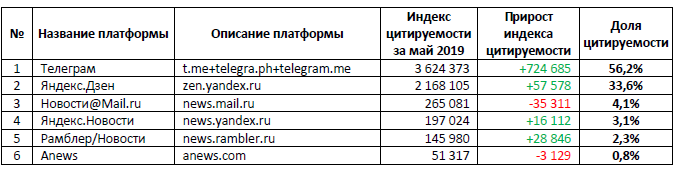 «Апрельское снижение цитируемости платформы Telegram стало разовым. В мае Telegram не только отыграл снижение, но и показал рекордную для 2019 года цитируемость — 3,6 млн ссылок», — отмечается в сообщении компании.
