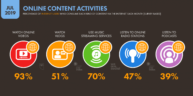 Если говорить в целом, то интернетом пользуется 56% населения. Из них 93% смотрят онлайн-видео, 70% используют стриминговые музыкальные сервисы, 51% смотрят видеоблоги, 47% слушают радиостанции, 39% — подкасты.
