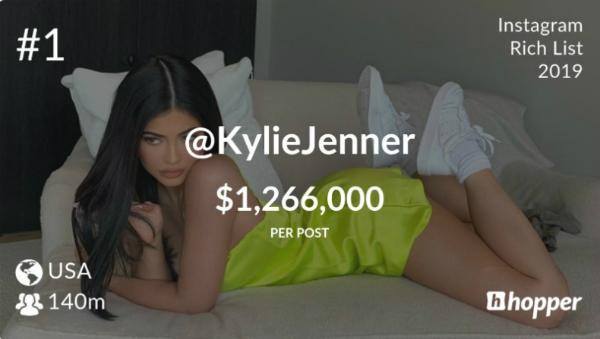 Сервис Hopper HQ опубликовал ежегодный рейтинг лидеров мнений в Instagram. Первое место удержала Кайли Дженнер, доход которой от каждого поста вырос с $1 млн до $1,3 млн. Аудитория модели в соцсети составляет 139,2 млн человек.