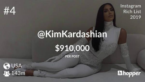 Немногим меньше Роналду за один рекламный пост получает Ким Кардашьян — ей бренды платят $910 тыс. при аудитории в 142,7 тыс. человек.