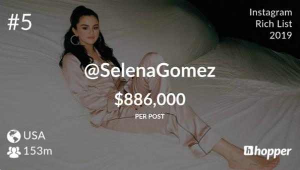 На пятое место опустилась Селена Гомес, занимавшая в прошлом году вторую строчку рейтинга. Тем не менее, стоимость поста в ее Instagram за год даже выросла и составила $886 тыс. против $800 тыс. в 2018 г.