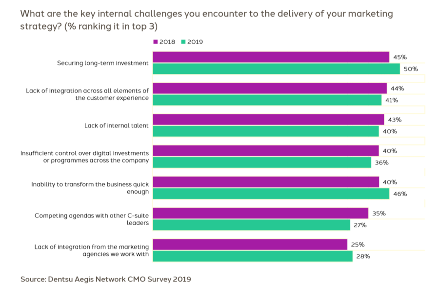 Долгосрочные маркетинговые инвестиции чаще всего препятствуют выполнению планов по продвижению компаний. Такого мнения придерживаются 50% участников исследования Dentsu Aegis Network. Вторая проблема для маркетологов — невозможность быстро провести трансформацию бизнеса, об этой проблеме в работе сказали 46% опрошенных. Третьим препятствием 41% маркетологов назвали недостаток интеграции всех элементов коммуникации с клиентами.