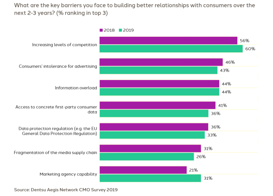 Что касается улучшения отношений с потребителями, основным барьером маркетологи считают растущую конкуренцию между компаниями — об этом вызове заявили 60% топ-менеджеров. 44% профессионалов считают, что наладить связи с аудиторией им мешает переизбыток информации, а третьим главным препятствием 43% маркетологов назвали неприятие рекламы потребителями.