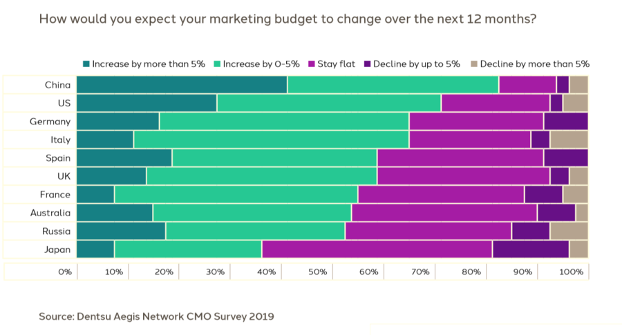 В России около 52% маркетологов планируют увеличить бюджет на рекламу в течение ближайшего года. Большая доля опрошенных российских директоров по маркетингу — 35% — собирается повысить медиаинвестиции не более чем на 5%. Около трети топ-менеджеров — 33% — хотят сохранить бюджеты на прежнем уровне.